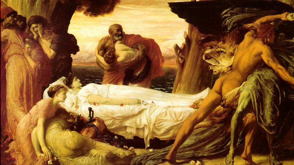 Alcestis’ influence also extends to the visual and performing arts, where her myth has inspired dramatic representations of devotion and mortality. Paintings such as Joseph Spiegl’s Hercules Brings Alcestis Back from the Underworld (1795) and Frederic Lord Leighton’s Hercules Wrestling with Death for the Body of Alcestis (1869–1871) capture the tension and heroism of her story. Operatic adaptations by Lully, Gluck, and Handel further translated her narrative into musical drama, while neoclassical and Romantic artists often depicted her with a mix of vulnerability and dignity. These visual and theatrical interpretations reinforced the emotional and ethical dimensions of her legend, cementing Alcestis as a symbol of courage and selflessness.