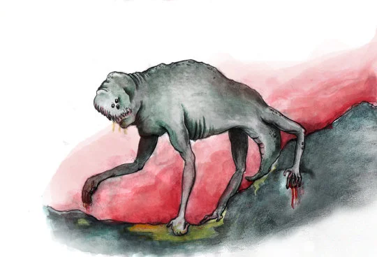 Descriptions of the Amikuk’s appearance vary among storytellers, reflecting the fluid nature of oral tradition. It is most commonly depicted as a long, sinewy, humanoid creature with leathery, dark skin that glistens like wet seal hide. Its body is said to be slick, hairless, and muscular, with four thin, flexible arms ending in claw-like fingers. The creature’s eyes glow an eerie reddish-orange in the darkness, and its mouth is filled with rows of sharp teeth perfect for grasping prey.