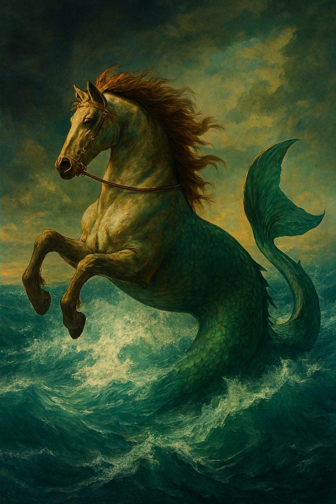 The Hippocampus is described as having the front half of a horse and the tail of a fish or dolphin. Its upper body includes a strong neck, a noble head, and flowing mane, while its lower half ends in a curling, scaly tail that allows it to glide through the water. Ancient Greek and Roman art often portrayed the Hippocampus with shimmering scales, fin-like wings, and long, coiled tails that resembled waves. The creature was painted in shades of green, blue, and silver, reflecting the light and motion of the sea. In some Phoenician and Etruscan versions, the Hippocampus was shown with wings, suggesting its divine ability to move between different realms. The shape of the creature later inspired the scientific name of the modern seahorse, whose curled body reminded early scientists of the mythical sea-horse.