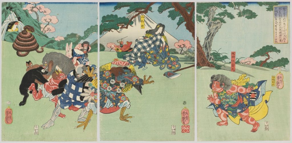 Kintaro is most famously raised by a yama-uba, a mountain woman who exists somewhere between spirit, witch, and guardian. While yama-uba figures are often portrayed as fearsome in folklore, Kintaro’s adoptive mother is nurturing and protective, guiding his growth without restraining his natural power. His true “family,” however, consists of the animals of the forest. Bears, deer, rabbits, and birds are depicted as his companions, reinforcing his role as a bridge between humanity and nature.