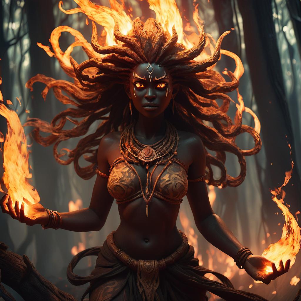 Descriptions of Nyale’s physical form are rare, as Bambara mythology often emphasizes symbolic roles over literal depictions. In her earlier form as Musukoroni, however, she is portrayed as a fiery and unsettling entity born from the decay of Pemba’s cosmic tree. Emerging from mildew and spittle, she embodies impurity, chaos, and transformation. This origin story emphasizes her organic, almost elemental birth, suggesting she is less a being of flesh and more a manifestation of cosmic imbalance.