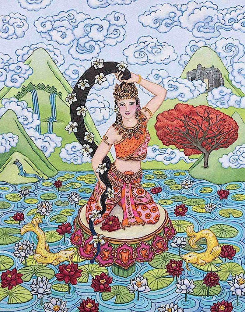 Phra Mae Thorani is the Earth Goddess in Thai, Lao, Khmer, and Burmese Buddhism, known for witnessing the Buddha’s merit and helping defeat Mara during his enlightenment.