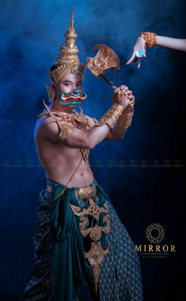 One of his most recognizable features is the magical axe he carries, an object tied directly to his ability to create thunder. His movements in performance are often exaggerated with high steps and sweeping gestures, presenting him as both menacing and somewhat oafish. These characteristics align with traditional portrayals of giants in Khmer mythology—powerful yet flawed beings who serve as the counterbalance to divine forces of order and renewal.