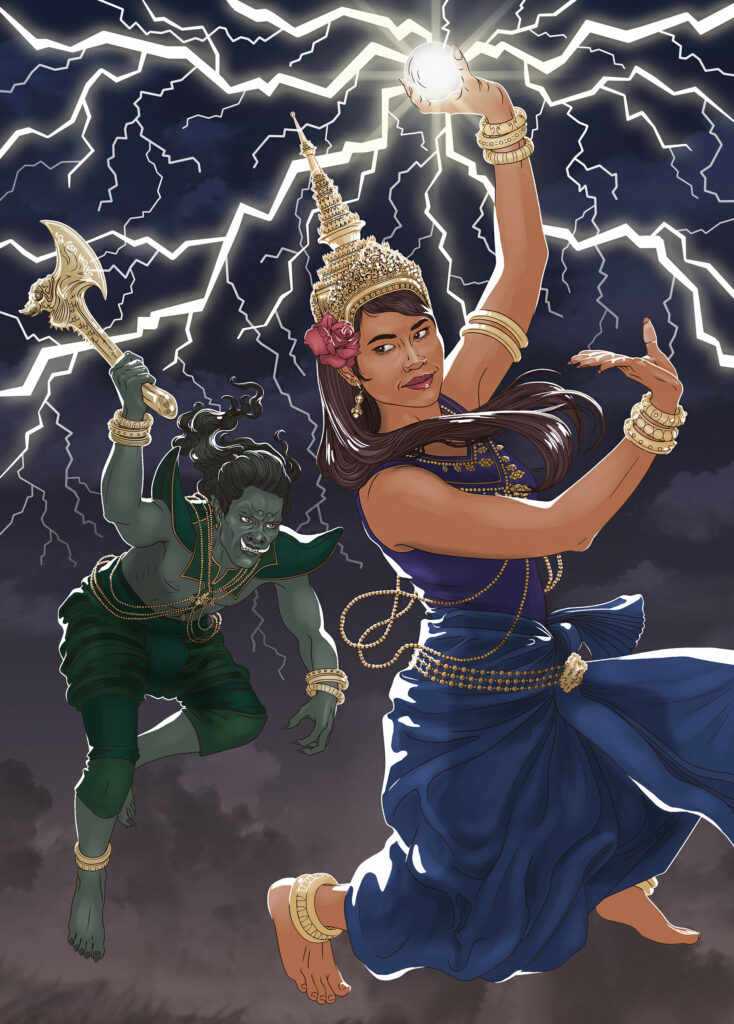 Even beyond ritual, his myth resonates with Cambodians as a way of interpreting the weather. The rumble of thunder is said to be the sound of Ream Eyso’s axe, while flashes of lightning are the sparkling brilliance of Moni Mekhala’s crystal ball. This natural symbolism ensures the myth remains relevant in daily life, especially for agricultural communities whose livelihoods depend on seasonal rains.