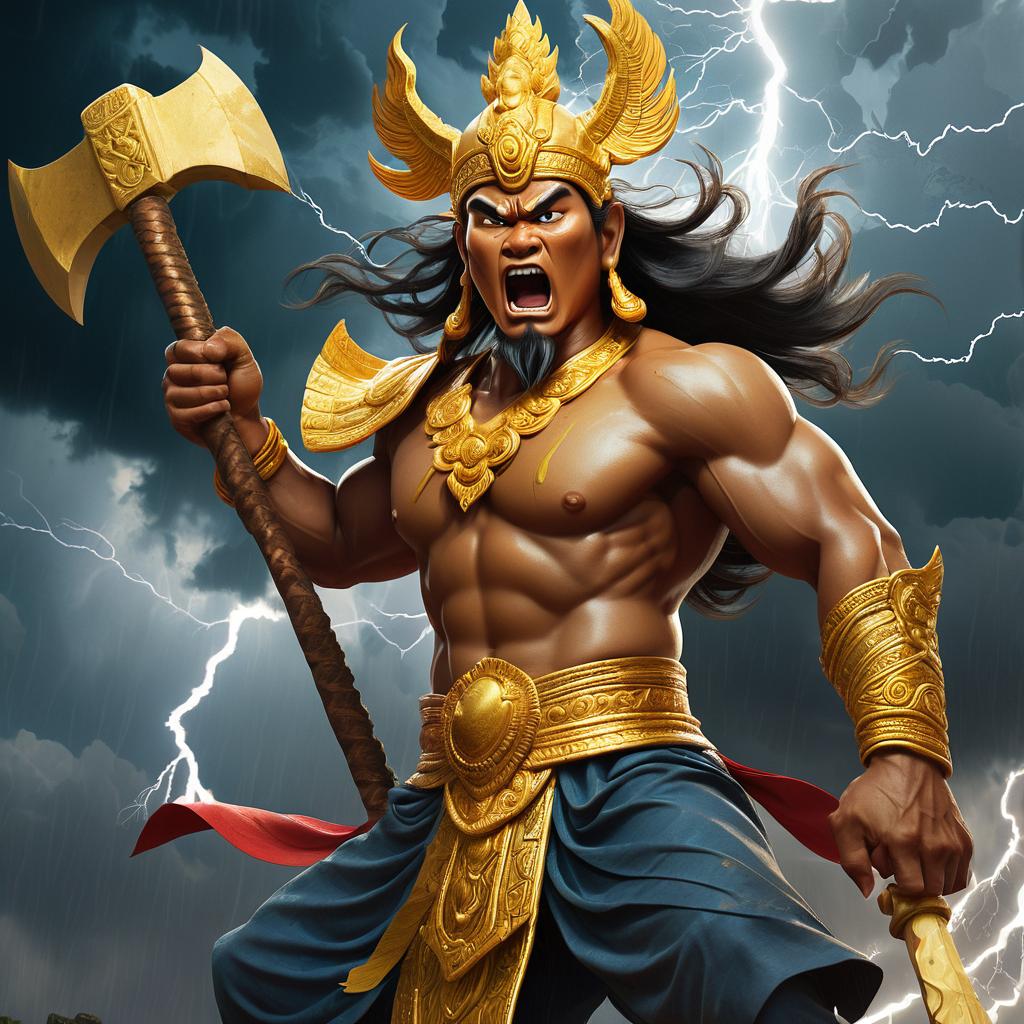 Ream Eyso’s defining power lies in his mastery over thunder and storms. Wielding his magical axe, he generates thunderclaps that shake the skies. His fiery rage is often linked to destructive winds and flashes of lightning, making him a symbol of chaos and natural upheaval.