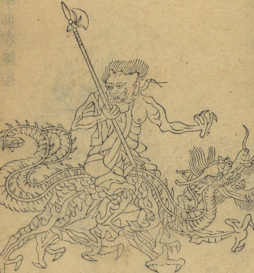He is described with a human face covered in white fur, tiger claws, a serpent on his left ear, and a battle-axe, often riding on two dragons.