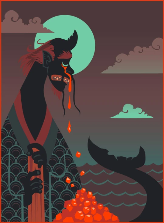 In the story, the creature’s chance encounter with a young man named Tōtarō leads to an unexpected friendship that reshapes both their destinies. Themes of exile, loyalty, forgiveness, and the hidden worth of the outcast run deeply through the narrative. Samebito’s jewel-weeping ability, turning sorrow into tangible treasure, reflects a cultural understanding of the ocean as both dangerous and generous—capable of producing beauty through hardship. Today, Samebito stands out among Japan’s sea-bound yōkai for its emotional depth and its rare portrayal as a being whose terrifying appearance hides a kind and noble spirit.