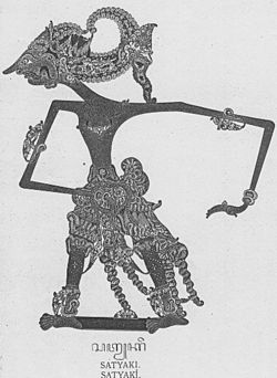 In Indonesian Wayang Kulit, Satyaki is represented with the stylized artistic conventions typical of Javanese puppetry. Figures are given elongated limbs, graceful hand movements, and intricately designed costumes that highlight their role and moral stature. Known locally as Setyaki, his puppet form emphasizes elegance and nobility rather than physical realism, reflecting the symbolic interpretation of his character within Javanese art.