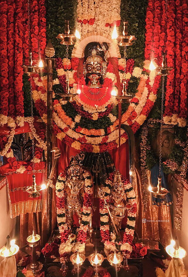 Although often mistakenly paired with a consort named Madathi, most traditions regard Sudalai Madan as unmarried. Instead, he is associated with companion spirits and local goddesses such as Pechiamman and Vanapechi, who appear in shrines near his temples.