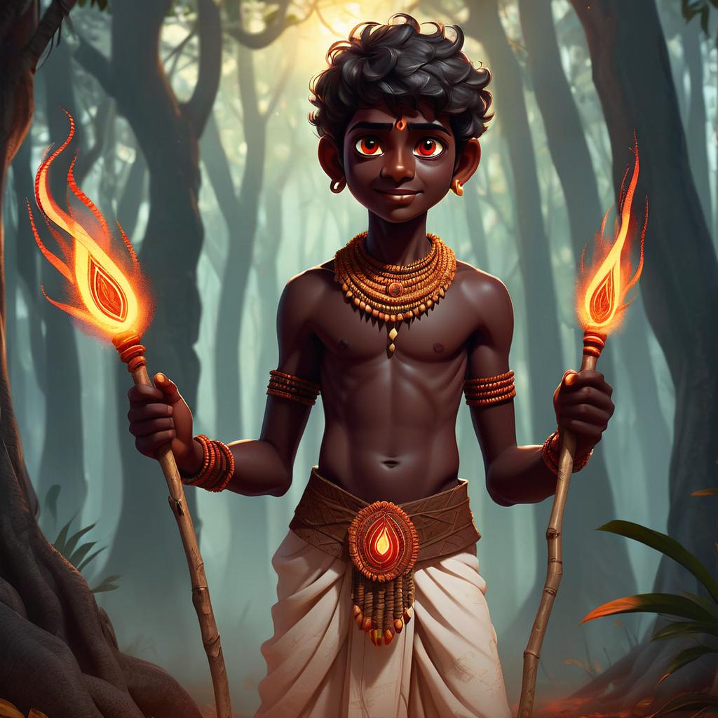 Theekutti Chathan is usually imagined as a dark-skinned boy around the age of twelve, with a lively face and a mischievous smile. His hair is often tied in a knot on the crown, called a kutumi, and his body is sometimes shown adorned with sacred ash or symbolic markings. In many depictions, he carries a small stick (kuruvadi) and rides a buffalo, signifying strength and command over spirits.