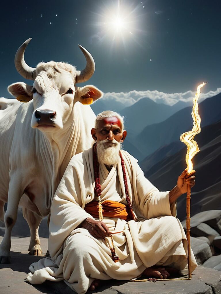 Descriptions of Vasistha’s appearance are highly symbolic, portraying him as an embodiment of serenity and divine insight. Ancient texts and artistic depictions often present him with a long flowing beard, radiant eyes, and a calm expression that reflects inner clarity. He is shown clad in simple white garments that signify detachment from material desires, and he typically carries a wooden staff (danda) and a water pot (kamandalu), both traditional symbols of a sage. In many temple sculptures and paintings, Vasistha is depicted alongside Kamadhenu, the wish-fulfilling cow, which represents his mastery over abundance and prosperity through spiritual discipline. Unlike heroic figures of mythology, his physical attributes emphasize purity, austerity, and wisdom rather than physical power, underscoring his role as a spiritual guide.