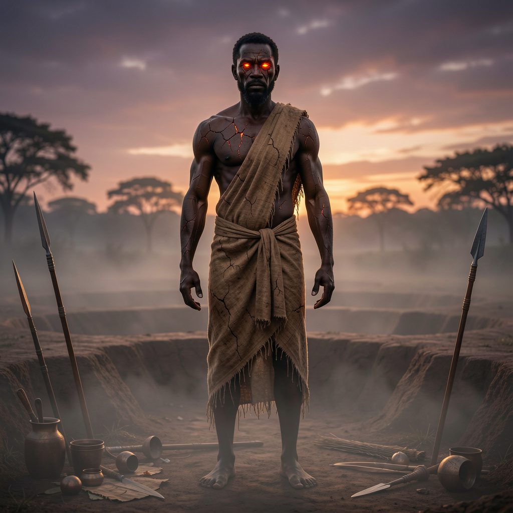 Traditional Ganda sources are notably restrained when it comes to Walumbe’s physical appearance. Unlike many mythic beings who are described in vivid, symbolic detail, Walumbe is defined more by his actions and his effects on the world than by a fixed form. He is consistently associated with the ground opening beneath human feet, with pits, tunnels, and underground spaces that swallow life without warning. This absence of physical description is not accidental. Walumbe represents death as an experience rather than a spectacle, something felt rather than seen.