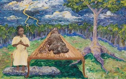 Woyengi is rarely described in physical form, reflecting the Ijaw belief that divinity transcends human appearance. Instead, her presence is symbolized through natural phenomena—thunder, lightning, and the sacred iroko tree. Her descent to earth is marked by a flash of lightning and the sound of thunder, which announces her creative arrival. She is often depicted standing on a sacred creation stone before a large table and chair, molding the first human beings from earth’s mud. This imagery represents her dominion over the elements and her authority as the origin of all life. The use of natural symbols to describe her—earth, storm, and light—emphasizes her connection to creation and transformation. As a goddess associated with both nurturing and judgment, Woyengi embodies the dual forces of fertility and power that sustain the world. Her appearance in myth is less about form and more about presence—a manifestation of divine energy and creative intelligence guiding the birth of humanity.